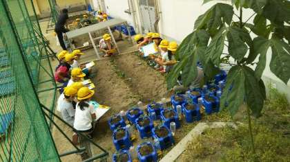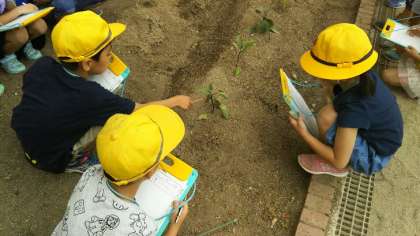2年生が、生活科の学習で植えた、野菜の苗の成長を観察していました。