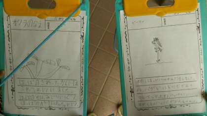 葉っぱのつき方や枚数をよく見て絵をかいていました。これからも成長していく様子や花、実のつき方などを継続して観察していきます。