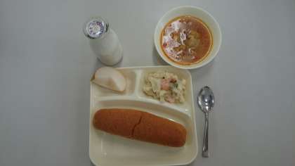 食材:えび、ぶたにく、粉末チーズ、薄力粉、マカロニ、パン粉、バター、サラダ油、ニンジン、たまねぎ、にんにく、キャベツ、セロリー、ホールトマト、さやえんどう、とうもろこし、なし