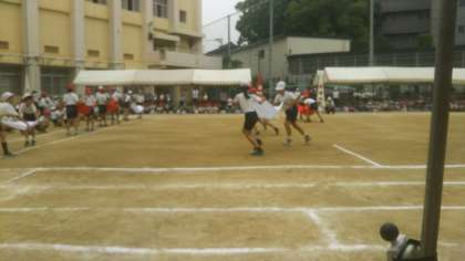 3年生最後の競技は、2人組で布の上にボールを乗せて運ぶ競技です。