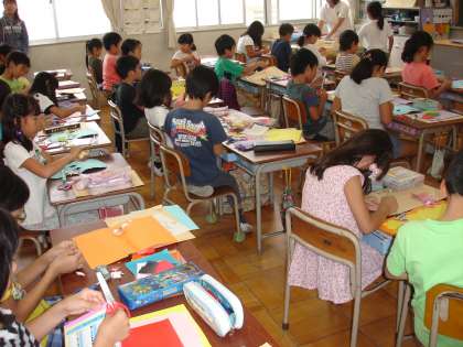 3年生の学習参観授業は図画工作科で、「とび出すカード」作りです。間近に迫ってきている運動会の案内状作りに取り組みました。とび出すしくみを工夫して考えました。