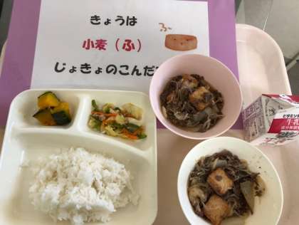 今日の献立 ●すき焼き煮 ●焼きかぼちゃ ●野菜のそぼろいため ●ごはん ●牛乳