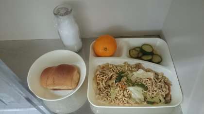 食材:ぶたにく、ちゅうかめん、ラー油、上白糖、サラダ油、ニンジン、たまねぎ、ピーマン、キャベツ、きゅうり、みかん
