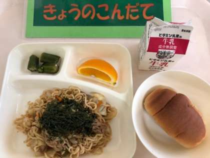 今日の献立 ●焼きそば ●オクラのかつお梅風味 ●オレンジ ●1/2黒糖パン ●牛乳