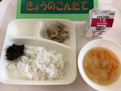 今日の献立 ●豚肉のごまみそ焼き ●すまし汁 ●のりのつくだ煮 ●ごはん ●牛乳