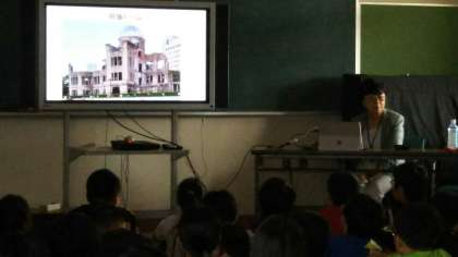 広島平和文化センターから、被爆体験伝承者の松田さんに来ていただき、6年生の子どもたちに、広島に投下された原爆の威力・被害等についてお話していただきました。