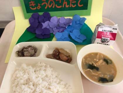 今日の献立 ●鶏肉の甘辛焼き ●みそ汁 ●キャベツの赤じそあえ ●ごはん ●牛乳