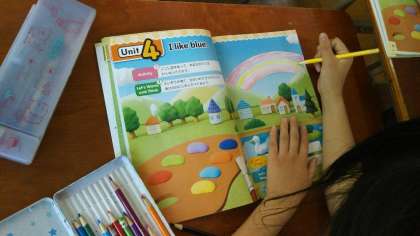 英語の歌を歌ったり、好きな色を聞かれて答えたり、テキストに好きな色をぬったりと楽しみながら学習していました。