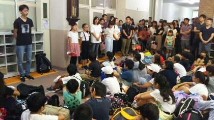 林間学習出発式を行い、桃陽小学校を出発しました。