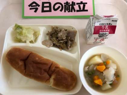 今日の給食 ●豚肉のカレー風味焼き ●スープ煮 ●サワーキャベツ ●おさつパン ●牛乳