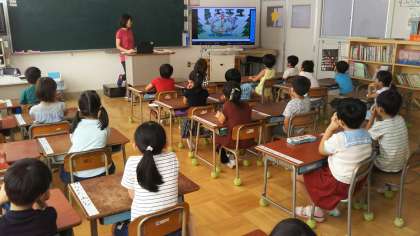 朝8時半から15分間のモジュールタイム、1年生2年生の教室をのぞくと、英語活動に取り組んでいました。