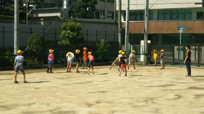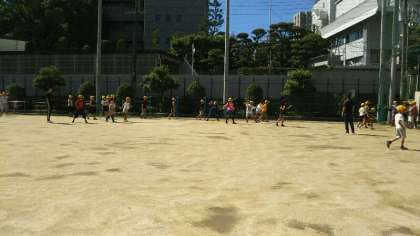 4年1組が、学級みんな遊びで、だるまさんがころんだをしていました。たくさんの人数で遊ぶととても楽しいです。