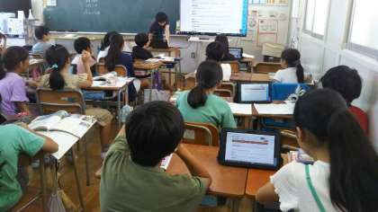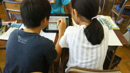 今日は、タブレットPCを使って、漁獲量に関する最新のデータを調べながら学習を進めていました。