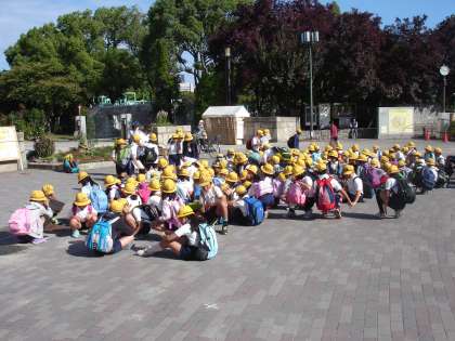台風一過、好天に恵まれ、3年と5年が大阪城公園へ秋のペア遠足に出かけました。