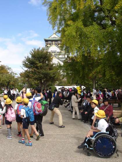 天守閣近くには、外国の人たちでいっぱいでした。おりしも、今大坂の陣400年天下一祭をしているので、よけいににぎわっていました。