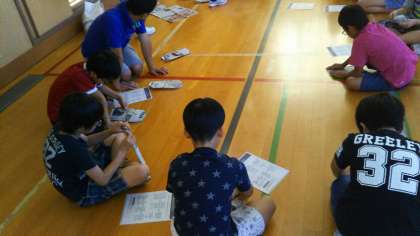 4つのブースに分かれて、災害時に備えた食料品・水などの備蓄、新聞紙でのスリッパづくり、物干しざおと毛布を使った簡易担架での傷病人搬送、避難時の持ち出しリュックの必需品などについて、順番に学習しています。