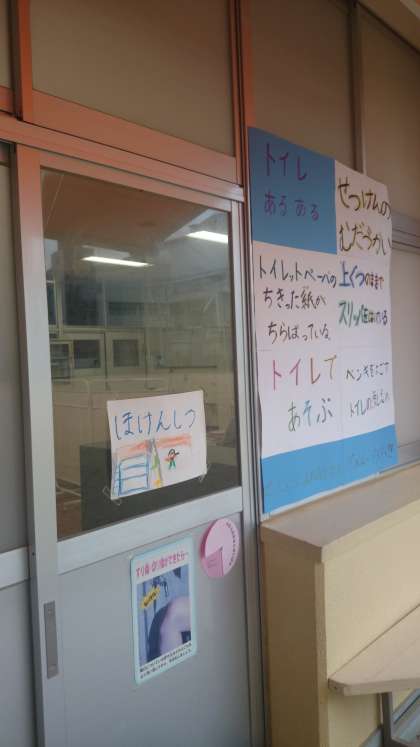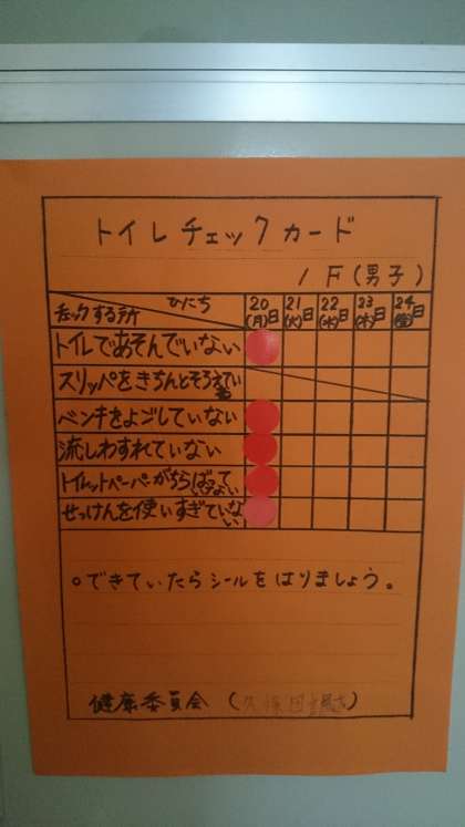 (下)トイレの扉に、子どもたちの自作のチェックシートを貼りました。