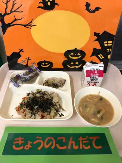 今日の給食 ●牛肉のきんぴらちらし ●みそ汁 ●キャベツの赤じそあえ ●牛乳