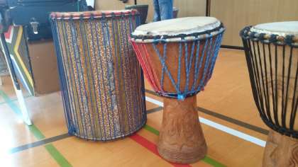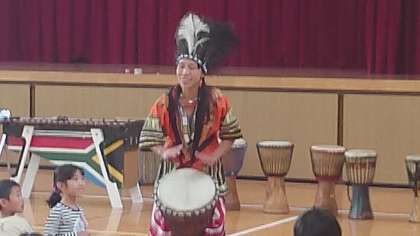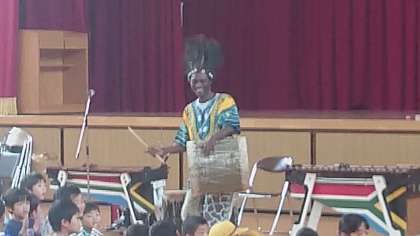 子どもたちみんなが、用意していただいた10数個の太鼓を代わる代わる全員がたたきました。ジョージさんの基本のリズムを一緒に演奏し、どんどん早くしていき、ジョージさんが、その上に、アドリブでいろいろなリズムをのっけていきます。みんな、大興奮です!!