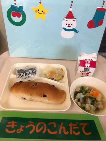 今日の給食 ●鶏肉と野菜のスープ煮 ●きのこのドリア ●ミニフィッシュ ●レーズンパン ●牛乳