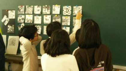 5年生が、図画工作でペンで繰り返し模様をかき、画面を構成する「ゼンタングル」に取り組んでいます。