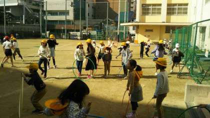 限られたスペースで、子どもたちが、少しでも運動に親しめるように、休み時間にフラフープを使って遊べるようにしました。