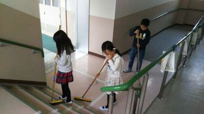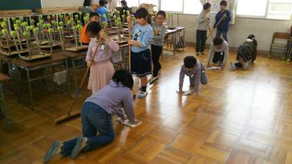 全校児童が、場所を分担して全員清掃活動を行っています。どの学年の児童も一生懸命掃除をしています。