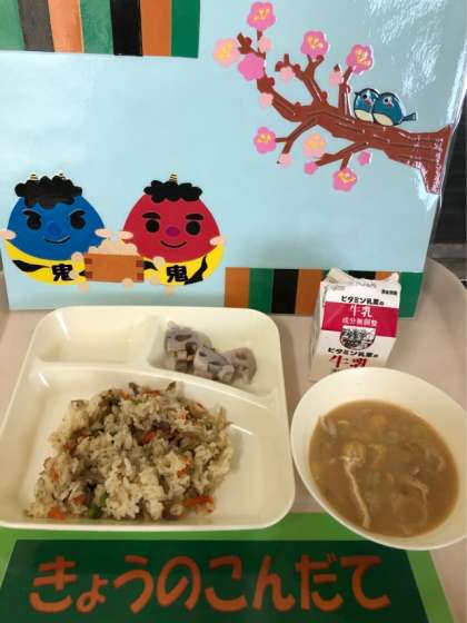 今日の給食 ●鶏ごぼうごはん ●みそ汁 ●焼きれんこん ●牛乳