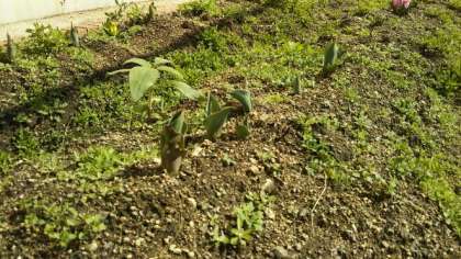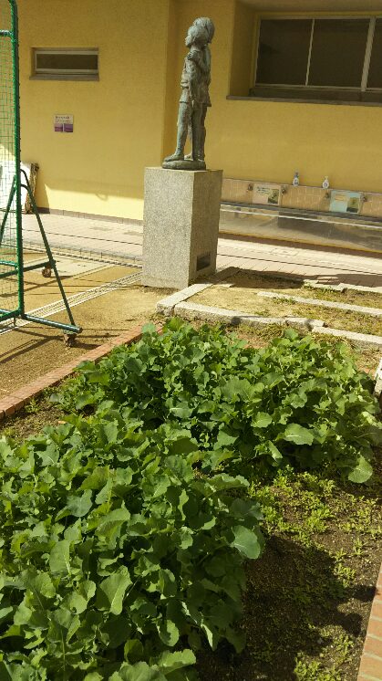 学習園では、チューリップが葉を伸ばし始めました。その奥では、去年のヒマワリが落とした種が芽を出して伸びています。(写真上)