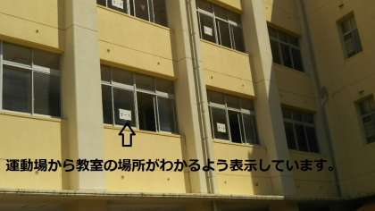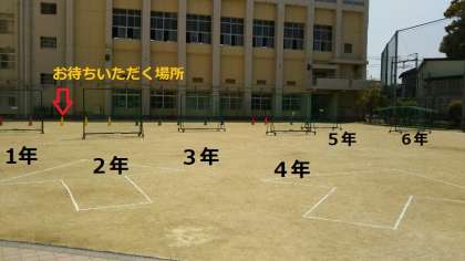 お子様の学級を確認した後、学年学級別を三角コーン(写真上)で示していますので、その場所にお並びください。職員が、順次教室への移動のお声かけをいたします。教室の場所は、運動場から確認できるように表示をしています。(写真下)