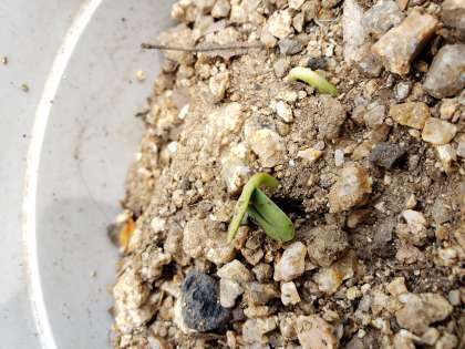 3年生のみなさん、学校でまいたヒマワリのたねが め を出しはじめました!(1まいめのしゃしん)
