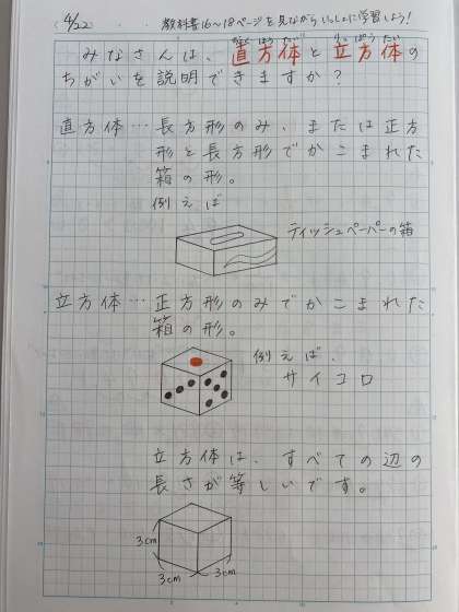 次の単元は「直方体や立方体のかさの表し方を考えよう」です。
