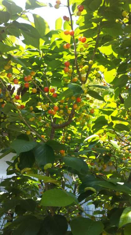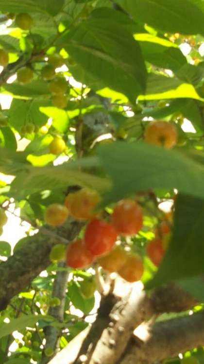 3月11日の記事で、満開のサクランボの花を紹介しましたが、それから約1カ月半。たくさんの実をつけています。
