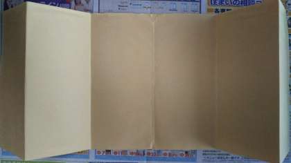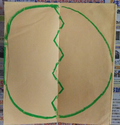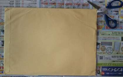 家にある使用済みの大きな封筒を写真のようにはさみを入れ、細長い1枚の紙になるよう、切り開く。