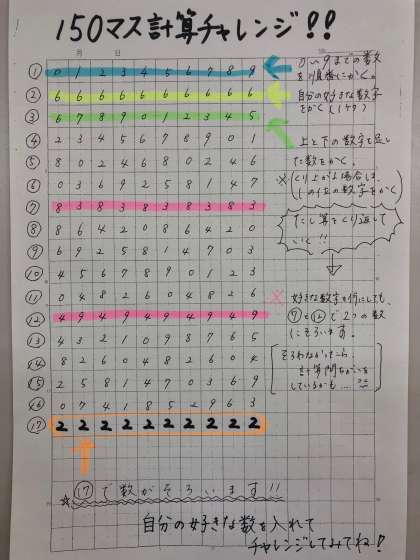 さて、先生からの挑戦状第2弾!150マス計算です!数のふしぎ、おもしろさをあじわえます!さぁ、紙と鉛筆を用意して、レッツチャレンジ!