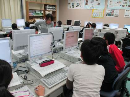 PCが得意な6年生ががんばっている4年生を教えています。