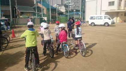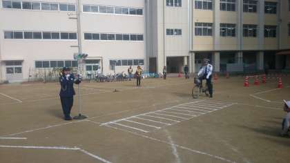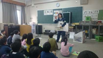 写真(上)多目的室に集合。交通法規(交通安全のきまり)を勉強。