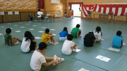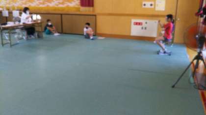 体育館の広いスペースで、換気をよくし、子どもたちが待つ間も、間隔をあけて座るようにしています。