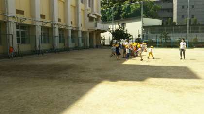 休み時間、運動場がたくさんの子どもであふれないように、出てよい時間は限られていますが、1年生もはじめて休み時間を運動場で過ごしました。