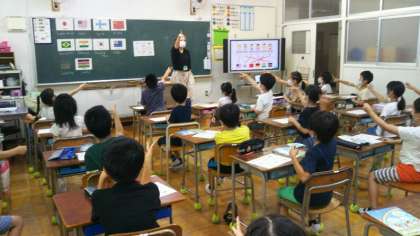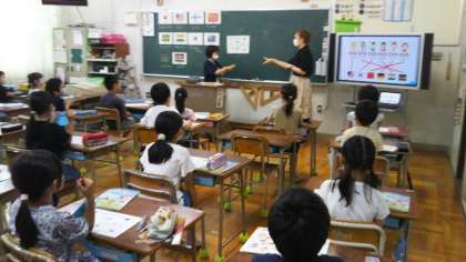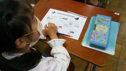 3年生が、外国語活動の時間に、C−NETの先生と、「ロック・シザ—・ペーパー」というかけ声でジャンケンをして、世界地図の上を旅行するというゲームをしていました。