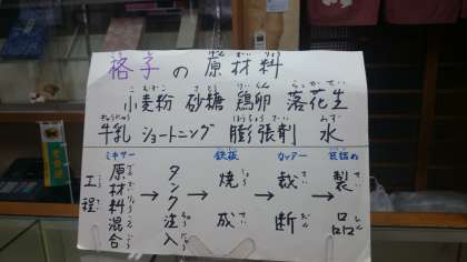 (中)お店の方が、手書きで「格子の原材料・工程」のパネルを作って下さっていました。