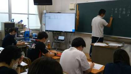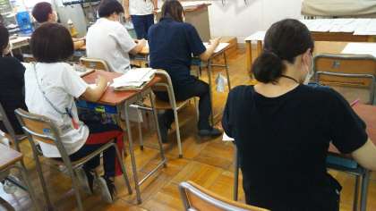子どもたちが帰った放課後の教室で、先生方が国語の指導について研修を行っています。