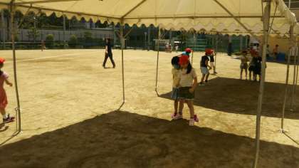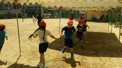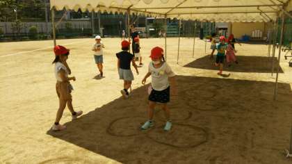 2年生の子どもたちが、昼休み、日除けテントの下で「ケン・ケン・パ」をして遊んでいました。