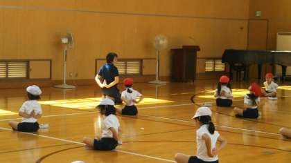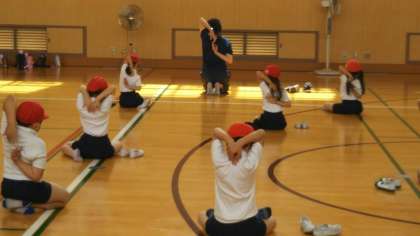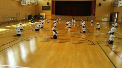 2年生が、体育の時間に柔軟性を高めるストレッチをしていました。