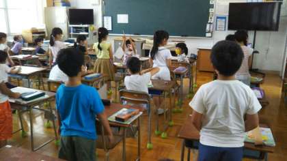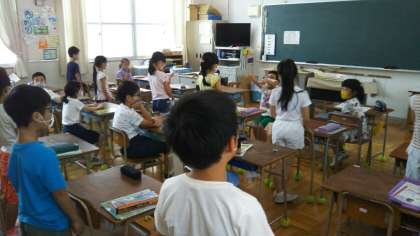 子どもたちを一人とばしで2グループに分けて、歌の練習をしています。