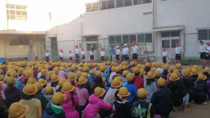 今日の全校朝会で、児童会の運動委員がなわとびの見本を全校児童に見せました。