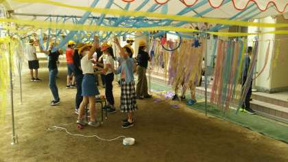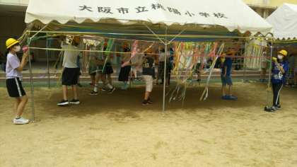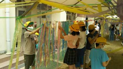 6年生が、図画工作の造形遊びの活動で、運動場にある日除けテントを飾る活動をしていました。