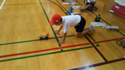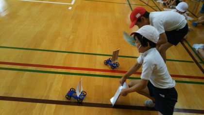 3年生が、理科の学習「風やゴムの力」で、実際に風やゴムの巻き戻る力を動力として、車を走らせる実験をしていました。