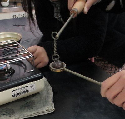 (上)熱した金属の玉が通りぬけるかたしかめる