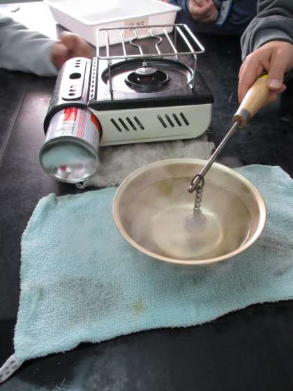 (中)金属の玉を水で冷やす